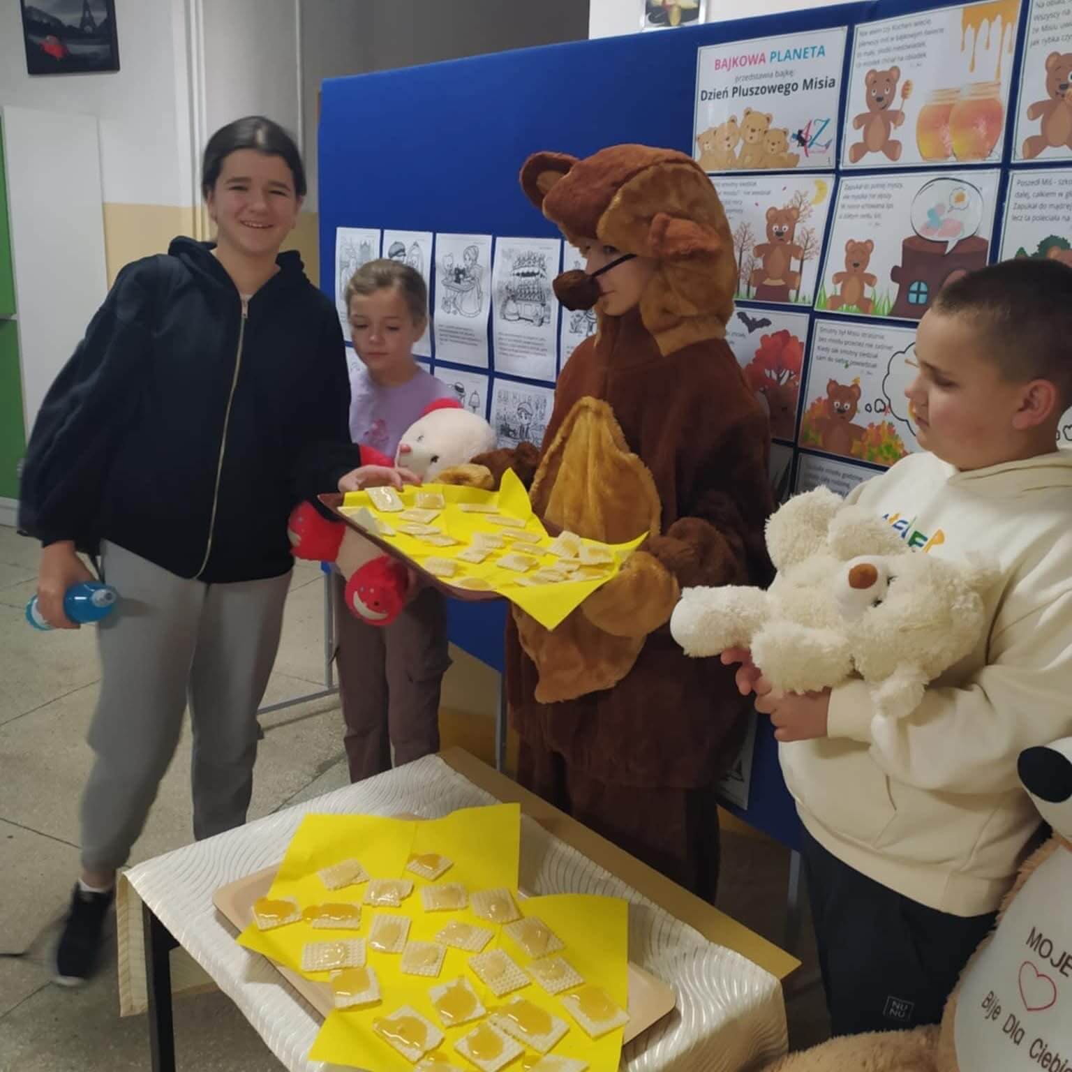 Podczas obchodów dzieci miały okazję poznać fascynującą historię pluszowych misiów oraz dowiedzieć się wielu ciekawostek na ich temat. Najmłodsi uczestnicy aktywnie brali udział w zabawach ruchowych, nie rozstając się ani na chwilę ze swoimi ukochanymi pluszakami. Główną atrakcją był “szkolny Miś”, który przygotował coś, co misie kochają najbardziej – wafelki z miodem. Ten smaczny i zdrowy poczęstunek cieszył się ogromnym zainteresowaniem wśród dzieci.