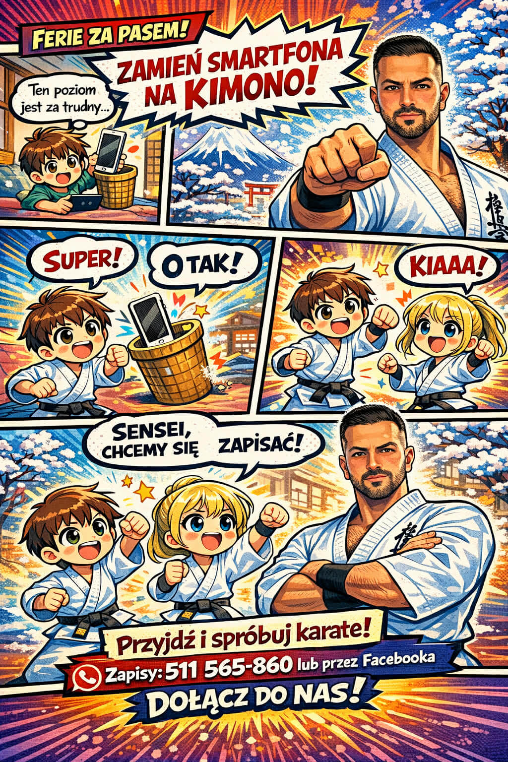 Ferie zimowe to świetny moment, aby spróbować czegoś nowego i aktywnego. Zamiast spędzać czas przed ekranem telefonu, warto postawić na ruch, rozwój i sportowe wyzwania. Właśnie dlatego w Łukowie rusza kolejna 26. edycja Zimowej Akademii Karate Kyokushin pod hasłem „Zamień smartfona na kimono”.
