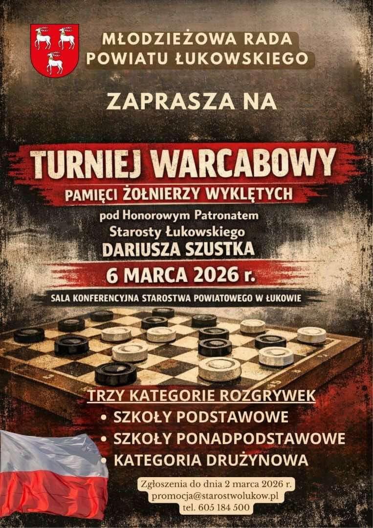 Młodzieżowa Rada Powiatu Łukowskiego zaprasza uczniów szkół z terenu powiatu do udziału w Turnieju Międzyszkolnym w Warcabach 64-polowych. Wydarzenie odbędzie się 6 marca 2026 roku w Sali Konferencyjnej Starostwa Powiatowego w Łukowie i zostało objęte Honorowym Patronatem Starosty Łukowskiego Dariusza Szustka.