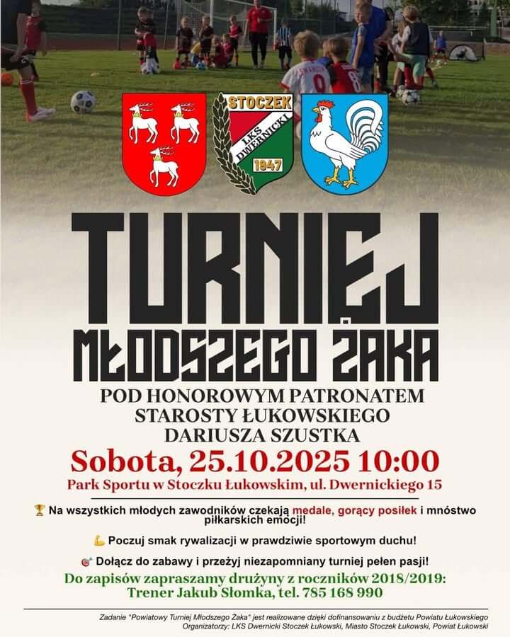 Na młodych adeptów piłki nożnej czeka sportowe wydarzenie – Turniej Młodszego Żaka pod honorowym patronatem Starosty Łukowskiego Dariusza Szustka. Zawody odbędą się w sobotę, 25 października 2025 roku o godzinie 10:00 w Parku Sportu w Stoczku Łukowskim przy ul. Dwernickiego 15.