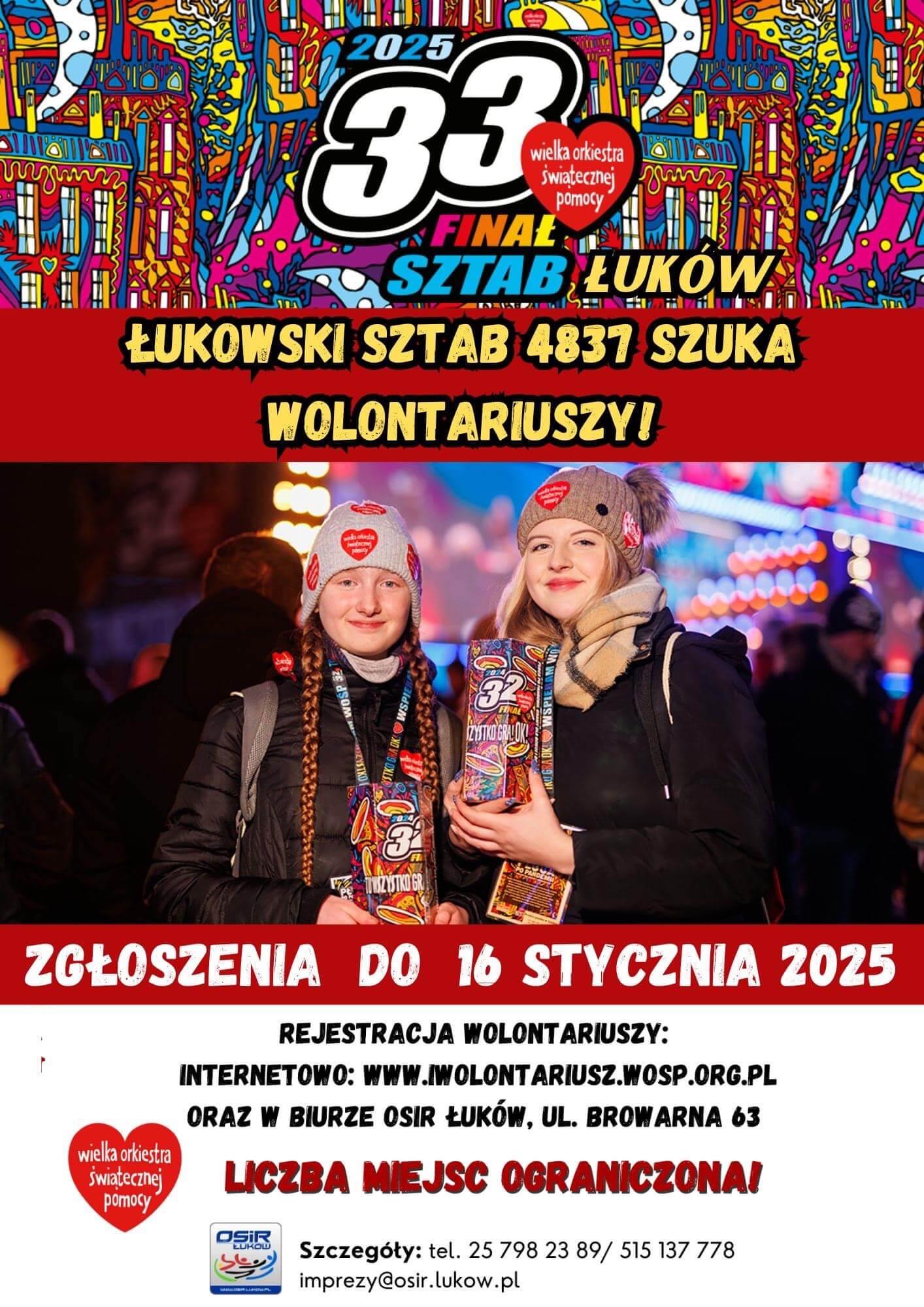Łukowski Sztab WOŚP, działający przy Ośrodku Sportu i Rekreacji w Łukowie, ogłasza nabór wolontariuszy na 33. Finał Wielkiej Orkiestry Świątecznej Pomocy.